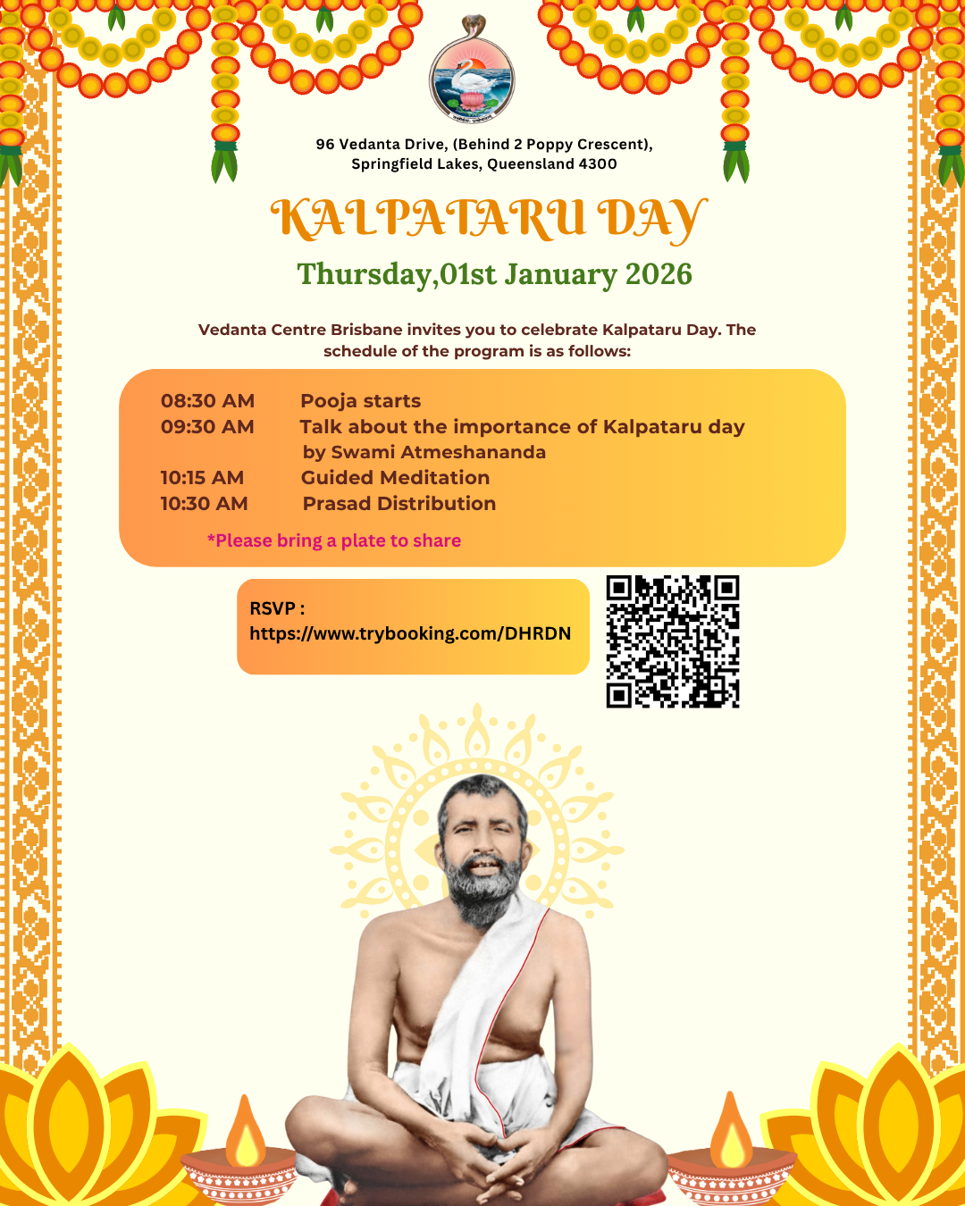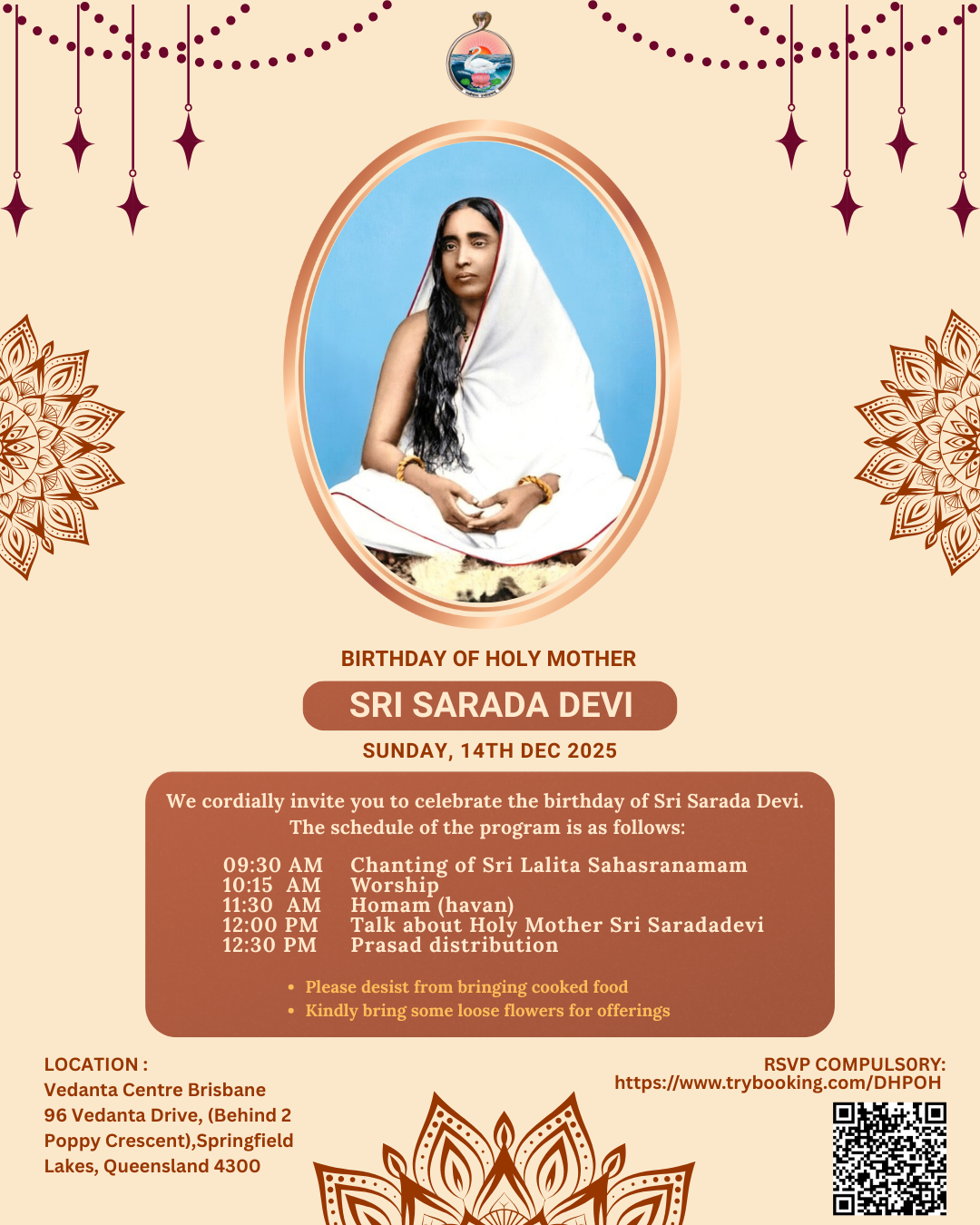 Vedanta Centre Brisbane 96 Vedanta Drive, Springfield Lakes, QLD, AustraliaWe wholeheartedly invite you to join us for the sacred celebration of Holy Mother Sri Sarada Devi’s Birthday — a morning filled with devotion, peace, and spiritual upliftment.